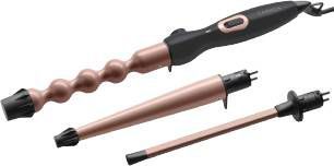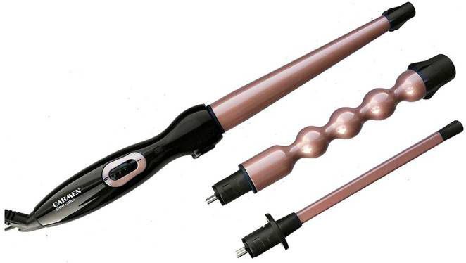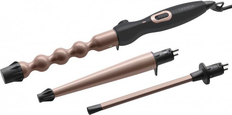 De Carmen CT 6525 is een multifunctionele krultang met drie verschillende opzetstukken om verschillende krullen te creëren. De bubbeltang voor het creëren van beachy waves, Chopstick opzetstuk voor superfijne krullen en een tapstoelopend conische tang voor speelse krullen.