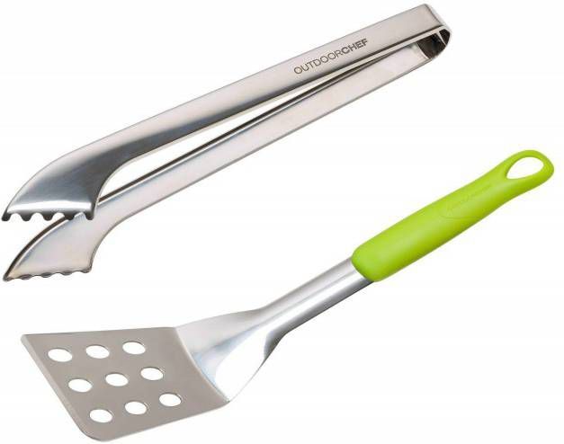 Deze Starter accessoireset van Outdoorchef bestaat uit een makkelijk hanteerbare spatel en tang gemaakt van roestvast staal. De spatel heeft een afgeronde hoek tegen het krassen en een groen, soft grip handvat. De tang is zo gemaakt dat je er heel precies mee kunt werken, ook voor kleine gerechtjes.GebruikMet deze accessoireset van Outdoorchef heb je het meest noodzakelijke direct in huis! De spatel gebruik je voor het omdraaien van onder andere hamburgers, terwijl je de tang juist voor het fijnere werk goed kunt gebruiken. Wil je een worstje, speklapje of sate omdraaien? Geen probleem met deze sterke tang. Dankzij de tandjes heb je goed houvast aan je etenswaar.