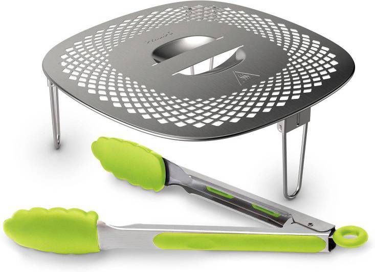 Lichte-snackset Accessoires en tips voor de beste Airfryer-snacks Bereid al uw favoriete snacks op een gezonde manier met deze lichte-snackset voor de Philips Airfryer. Geniet van gezonde, zelfgemaakte groentesnacks, gedroogde vruchten en meer. Maak uw favoriete snacks met de snackdeksel Maak uw favoriete snacks met de snackdeksel. Geniet op een eenvoudige en snelle manier van gezonde groentesnacks zoals boerenkool, bieten of gedroogde vruchten of van kippenvleugeltjes of buikspek. Verwijder de snacks met behulp van de tang, gemaakt van siliconen en gemakkelijk vast te houden Verwijder de snacks met behulp van de tang, gemaakt van siliconen en gemakkelijk vast te houden. De beste manier voor maximaal gemak en handigheid. Boekje om uw Airfryer-snacks optimaal te bereiden Inclusief boekje met tips van de chef, recepten voor beginners en baktijden voor de Airfryer Vaatwasmachinebestendige onderdelen voor eenvoudig schoonmaken U kunt de snackdeksel en de tang van uw Airfryer veilig in uw vaatwasmachine zetten waardoor deze zelfs nog gemakkelijker zijn om te hergebruiken. Snackdeksel met inklapbare poten voor eenvoudig opbergen Klap de poten van de snackdeksel in voor eenvoudig opbergen.