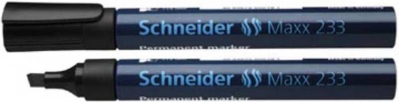 Schneider Marker Permanent 233 Beitel Zwart 10st./h3#Permanentmarker met beitelpunt, schrijfbreedte ca. 1 en 5 mm. Vrijwel reukloos, geen toevoeging van Toluol en Xylol, sneldrogend, lichtecht, veeg- en watervast. Dop met praktische clip. Cap-off inkt, dat betekent dat de marker meerdere dagen zonder dop kan liggen zonder uit te drogen. Aluminium houder, navulbaar met navulfles 650. Schrijfkleur zwart.Schneider permanent marker Maxx 233, zwart