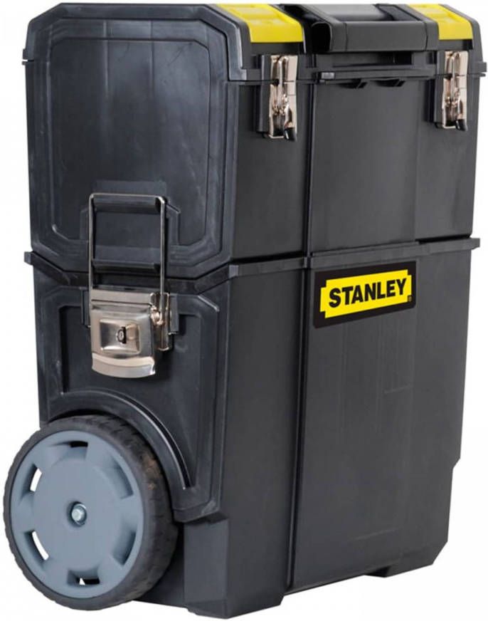 Deze Stanley 3-in-1 mobiele gereedschapswagen heeft enorm veel opbergruimte voor handgereedschap en elektrisch gereedschap. Deze rollende koffer heeft een afneembare gereedschapskoffer met kleine opbergruimte voor kleine onderdelen op het deksel en een uitneembare assortimentsdoos voor kleine onderdelen en accessoires. Er wordt een afneembare tray meegeleverd voor belangrijk gereedschap. De bak aan de onderkant heeft grote wielen van 18 cm en de uittrekbare handgreep aan de bovenkant zorgt ervoor dat u eenvoudig en handig kunt manoeuvreren. Daarnaast zorgen de grote metalen vergrendelingen ervoor dat de units met elkaar kunnen worden verbonden.