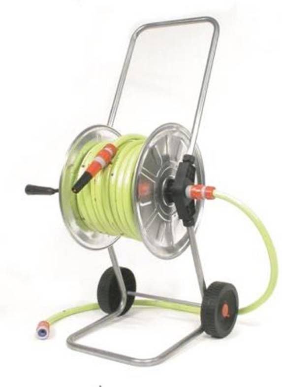 Deze haspel is al gemonteerd met een 25 meter 5/8 inch getricoteerd gele slang en de bijhorende 3/4 inch snelkoppelingen. De haspel is voorzien van twee wielen zodat u d.